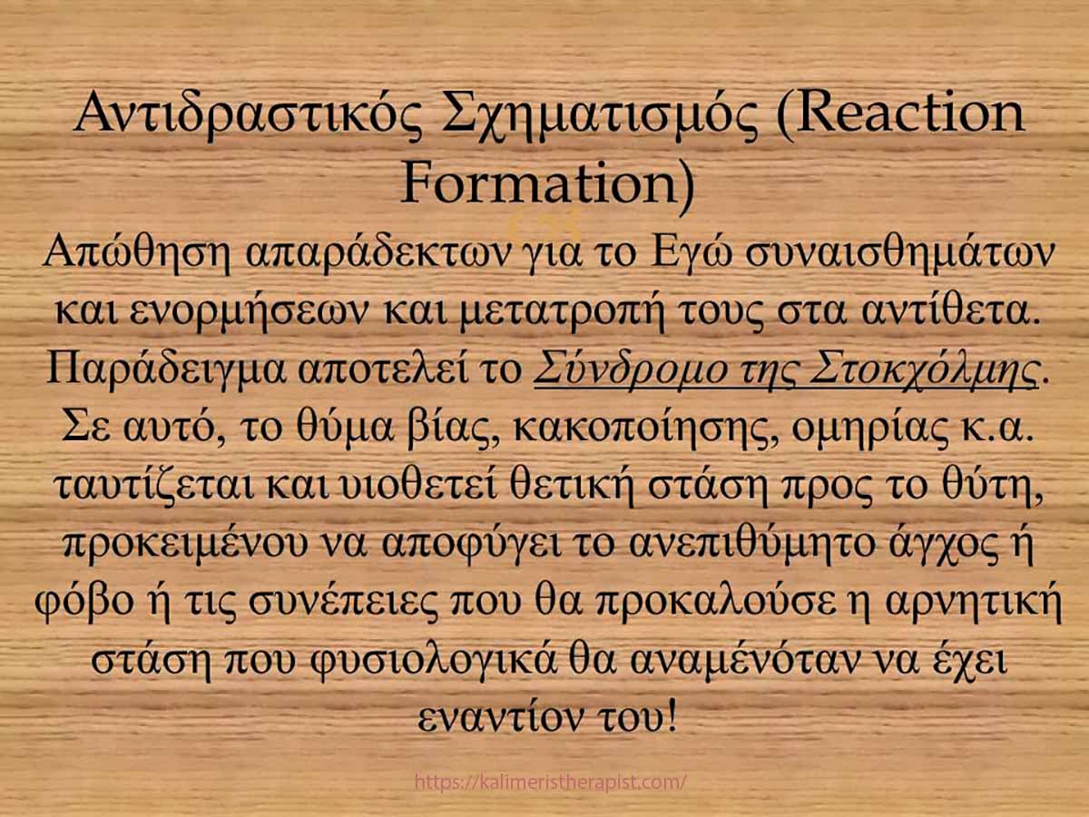 Ο αντιδραστικός σχηματισμός είναι μια ιδιόμορφη άμυνα απέναντι στην ύπαρξη απαράδεκτων επιθυμιών και συναισθημάτων. Εχθρικές, εγωιστικές, επιθετικές αναπαραστάσεις, “βρώμικες” επιθυμίες, συναισθήματα μίσους, οργής δεν είναι εύκολα αποδεκτά, “δικάζονται” από την εσωτερική συνείδηση (Υπερεγώ ενδεχομένως), μετατρέπονται σε κάτι αντίθετο π.χ. αγάπη, φιλία, εμμονή με την καθαριότητα κ.λ.π. και προβάλλονται με μεγάλη έμφαση.